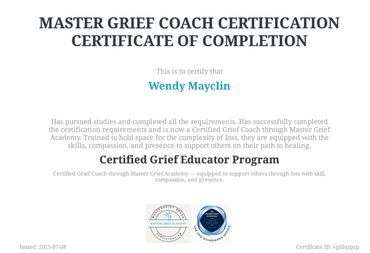 I am now a certified grief coach and I am accredited in over 80 country's. I bring a unique perspective, skilled in creating a safe, nurturing space and equip clients with tools that foster resilience and renewal.